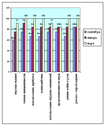 | 5 | Интерес, использование игровых действий | Высокий Хороший Достаточный Удовлетворительный Низкий Очень низкий | 4-33,4% 2-16,6% 1-8,4% 2-16,6% 2-16,6% 1-8,4% | 4-33,6% 2-16,6% 2-16,6% 2-16,6% 2-16,6% - | 4-33,4% 3-25,0% 3-25,0% 1-8,3% 1-8,3% - |