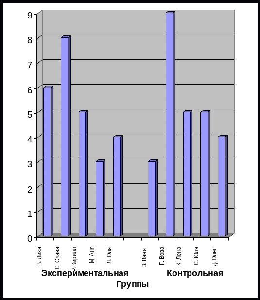 По результатам констатирующего эксперимента был сделан вывод, что менее всего развит словарный запас у М. Ани и Л. Оли, а также присутствуют пробелы в словарном запасе у В. Лизы, Р. Кирилла.