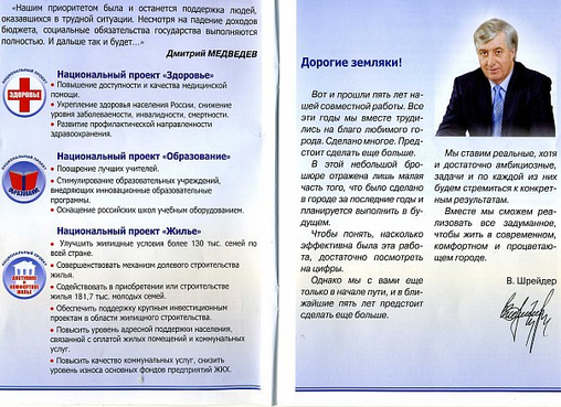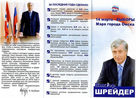 Касательно В. Шрейдера, хочется отметить, что этот кандидат занимался политической игрой, поскольку его кампания не была скандальной, зрелищной, не были использованы игровые моменты как доминирующие. Вся кампания строилась на результате предыдущего срока пребывания в качестве мэра. Все лозунги, предвыборная программа, плакаты, агитация была понятна любому человеку(см. Рис. 5-9), что нельзя сказать о листовках И. Зуги (см. Рис. 10 -1).