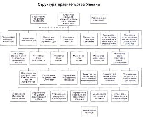 Высшим органом исполнительной власти является правительство, которое в Японии называется кабинетом министров. Его деятельность осуществляется на основе конституции, Закона о кабинете министров (1947 г.) и Закона об организации государственного управления (1948 г.).