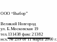Настоящим сообщаем, что ООО “Выбор” предоставляет создаваемому Культурному фонду “Наследники Гейне” свой юридический адрес: Великий Новгород ул. Большая Московская 19.