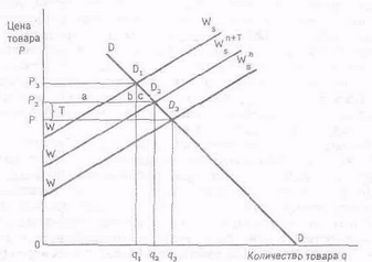 На графике линия WWs обозначает динамику предложения товара на мировом рынке до момента введения таможенного тарифа; линия WWsn - тенденцию предложения на рынке к моменту установления тарифа Т, когда поставщики, опасаясь потерять рынки, снизили цену на величину РР3, превышающую величину тарифа Т; линия WWsn+Tпредложение товара на рынке после установления тарифа. Параметры q1, q2, q3 показывают соответствующее количество приобретенного товара, а линия DDi—потребность в импортном товаре, изменяющаяся в зависимости от цены.