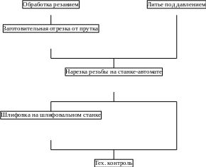 | Обработка резанием — процессы механического срезания поверхностных слоев материала в виде стружки лезвийными или абразивными инструментами на металлорежущих станках с целью получения деталей с заданными формой, размерами и качеством поверхностей. Основные виды процессов обработки резанием: точение, растачивание, фрезерование, строгание, сверление, зенкерование, развертывание, протягивание, шлифование, полирование, суперфиниш, доводка. Разрабатываемая деталь выполняется с помощью токарной обработки. Процессы обработки резанием имеют свои уникальные технологические возможности: малую энергоемкость и большую объемную производительность; относительная простота и универсальность формы режущих инструментов, обеспечивающих получение простейших и сложных поверхностей. Для обработки деталей РЭА резанием применяют металлорежущие станки всех основных групп. При массовом и крупно-серийном типах производств широко используют станки-автоматы. | Технологический процесс формообразования литьем под давлением выполняют на специальных литейных машинах. Основные преимущества процесса литья под давлением: высокая производительность, высокая точность размеров отливок, возможность получать тонкостенные детали сложной формы, низкая трудоемкость, рациональное использование исходного материала, высокая чистота поверхностей отливки (5-8 класс). К наиболее существенным недостаткам литья под давлением относятся: пористость массы заготовки (из-за высоких скоростей движения жидкого материала при заполнении формы и быстрого остывания металла в форме), высокая стоимость пресс-форм. |
