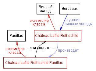 Все экземпляры класса Вино и его подкласс Pauillac имеют слот производитель, значение которого является экземпляром класса Винный завод (Рис. 1). Все экземпляры класса Винный завод имеют слот производит, относящийся ко всем винам (экземплярам класса Вино и его подклассов), которые производятся на этом заводе.