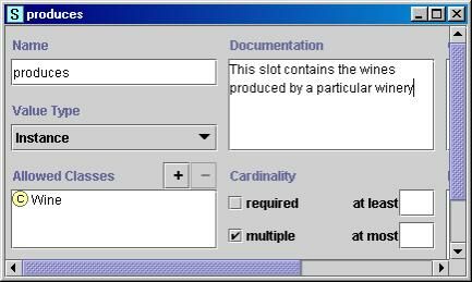 Рис. 4. Определение слота производит, который описывает вина, производимые на винном заводе. Слот имеет множественную мощность и значение типа Экземпляр.