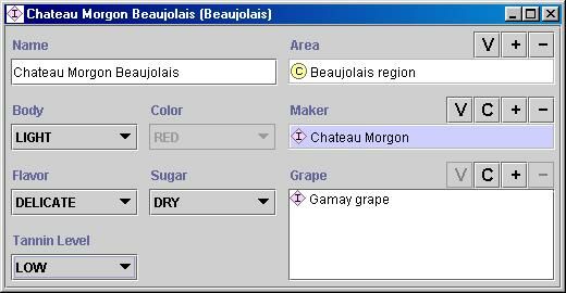 Рис. 5. Определение экземпляра класса Beaujolais. Экземпляром является вино Chateua Morgon Beaujolais из области Beaujolais, произведенное из винограда Gamay на заводе Chateau Morgon. Оно легкое, с мягким вкусом, красное, с низким уровень танина. Это сухое вино.