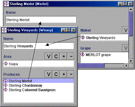 Рис. 9. Экземпляры с обратными слотами. Слот производит класса Винный завод является обратным для слота производитель класса Вино. Заполнение одного из слотов приводит к автоматическому обновлению другого.