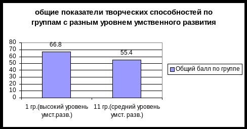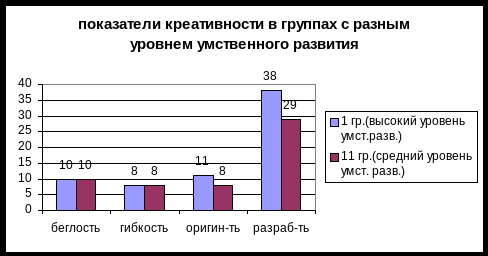 Как видно из представленной таблицы, по показателям беглости и гибкости мышления дети 1 и 11 группы практически не отличаются. Однако можно отметить тенденцию к повышению уровня оригинальности и значительное повышение уровня разработанности. Если для 1 группы последний показатель в среднем равен 38 баллам, то для 11 группы – уже 29 баллам. То есть, более высокий уровень умственного развития и более высокий уровень развития разработанности творческого мышления взаимосвязаны друг с другом.