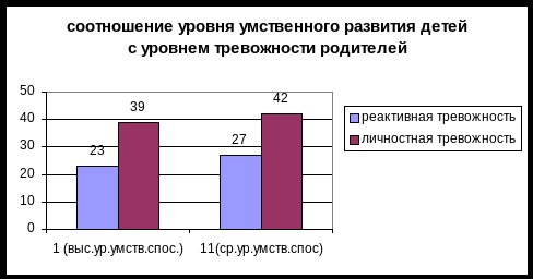 Можно предположить, что при проведении аналогичного исследования на более обширной группе данные тенденции приобрели бы вид закономерностей: уровень умственного развития детей находится в обратной зависимости от уровня реактивной и личностной тревожности родителей.