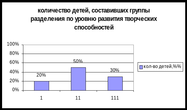 Полученные данные дают нам возможность разделить детей на группы по уровню развития творческих способностей следующим образом, обозначив их соответственно 111 (показатели ниже нормативных), 11 (показатели соответствующие норме и выше нормы, но не более чем в 2 раза), 1 (показатели, превышающие нормативные более чем в 2 раза).
