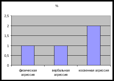 В итоге были получены следующие результаты: у одного подростка, что составляет 5 % наблюдается физическая агрессия (1), у одного подростка, что составляет также 5% наблюдается вербальная агрессия (2), у двух подростков (10%) наблюдается косвенная агрессия (5,10). В процентах это можно выразить на рис. 2.