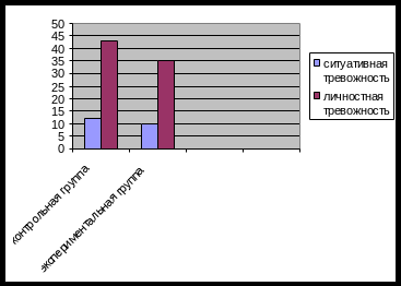 После проведения тренинга у пациентов наблюдается снижение ситуативной с 15% до 13% в контрольной группе и до 10% в экспериментальной группах. Снижение личностной тревожности произошло с 45% до 43% в контрольной и до 35 % в экспериментальной группах.