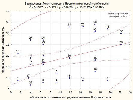 | Абсолютное отклонение от среднего значения локус-контроля | r = 0,3711 (p = 0,048) |