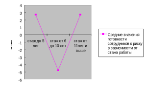 У первой группы (стаж работы которых до 5 лет) и у третьей группы (стажем работы от 11 лет и больше) показатели готовности к риску равны и составляют + 2,7.