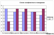 По графику №1 стили конфликтного поведения выявлено: у мужчин в большей степени выражен стиль конфликтного поведения соперничество, у женщин - в меньшей степени. Такой стиль поведения, в большей степени свойственный активным и агрессивным представителям мужского пола с мотивацией активно-оборонительного поведения или самоутверждения в качестве доминирующих мотиваций. У мужчин в меньшей степени выражен стиль приспособление, чем у женщин.
