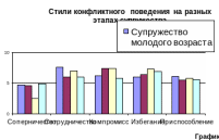 По графику №3 стили конфликтного поведения на разных этапах супружества выявлено: соперничество на этапах Молодое супружество, Супружество среднего возраста и Супружество пожилого возраста выражено одинаково, на этапе Супружество зрелого возраста соперничество маловыраженное.