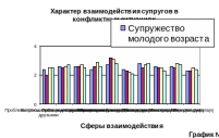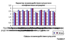 По графику №2 характер взаимодействия супругов в конфликтных ситуациях выявлено: Мужчины более пассивны, чем женщины за исключением сфер, связанных с рассогласованием норм поведения и проявление ревности.