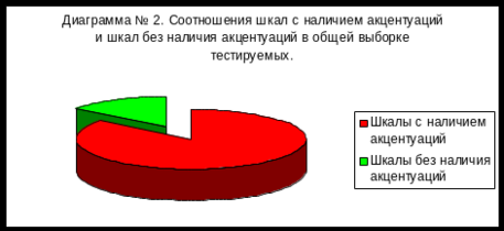 Соотношения по вышеуказанным параметрам, отраженное на Диаграмме № 2, составляет 8,55 к 1,45. Таким образом, выходит, что количество шкал, подтверждающих наличие акцентуаций характера у среднестатистического тестируемого в 5,897 раз выше, нежели количество шкал опровергающих наличие акцентуаций.
