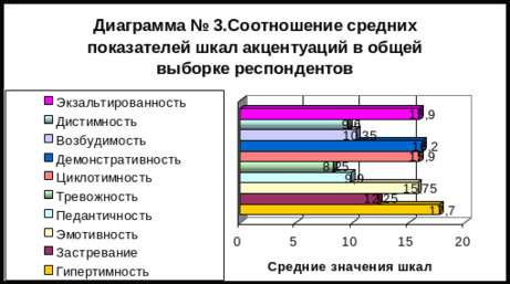 На данном этапе обработки данных мы проанализировали соотношение средних значений числовых показателей каждой шкалы акцентуаций в общей выборке респондентов. Данное соотношение отображено в Диаграмме № 3.