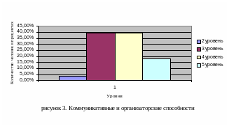 У 39,3 % испытуемых присутствует 3 уровень со средними проявлениями коммуникативных и организаторских склонностей. Для данных людей характерен проявления коммуникативных и организаторских склонностей. Обладают в целом средними показателями, они стремятся к контактам с людьми, не ограничивают круг своих знакомых, отстаивают свое мнение, планируют свою работу. Однако «потенциал» этих склонностей не отличается высокой устойчивостью. Эта группа испытуемых нуждается в дальнейшей серьезной и планомерной воспитательной работе с ними по формированию и развитию их коммуникативных и организаторских способностей.