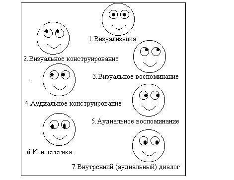 Когда мы визуализируем что-то из нашего прошлого опыта, наши глаза имеют тенденцию перемещаться вверх и влево по отношению к нам. Во время конструирования картинки из слов или в то время, когда мы пытаемся “вообразить” себе нечто такое, что мы никогда раньше не видели, наши глаза поднимаются вверх и вправо. Глаза перемещаются по горизонтали влево, когда мы вспоминаем звуки и по горизонтали вправо, когда мы конструируем их. При получении доступа к ощущениям типичным является движение глаз вниз и вправо. Когда мы разговариваем сами с собой, наши глаза чаще всего находятся внизу слева. Расфокусированный взгляд прямо перед собой, когда собеседник смотрит на вас и не видит вас, тоже говорит о визуализации.