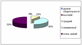 Высокий уровень общительности не показал никто (0%), средний –1 человек, заниженный – 4 человека, очень низкий – 5 человек.