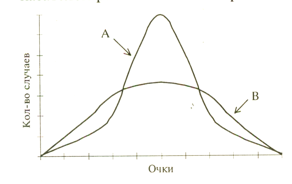 Рис. 1. Гипотетическое «колокольное» распределение интеллекта среди женщин – А и мужчин – В.
