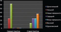 У результаті аналізу показників рівнів самооцінки виявлено, що у середніх підлітків більш вираженою є занижений рівень самооцінки 41%, ці результати спостерігаються і в групі старших підлітків рівень заниженої самооцінки яких складає 50%.