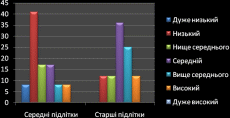 В результаті проведеного нами експериментального дослідження самооцінки учнів отримали дані, наведені у таблицях 5-6. Порівнюючи дані, ми можемо зробити висновок, що у старших та середніх підлітків спостерігається занижений тип самооцінки, для наявності відобразили ці дані на діаграмі №3.