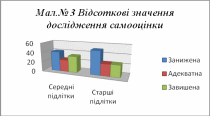 З досліджень самооцінки спостерігаємо таку картину, з 12 учнів середніх підлітків 5 учнів мають занижену самооцінку, 4 – учні мають адекватну самооцінку, 3 учні мають завищену самооцінку.