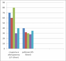 В моём исследовании приняли участие 30 испытуемых двух возрастных групп: студенты 1-2 курса(17-19 лет, 10 девушек и 5 молодых людей) и рабочие в возрасте 45-50 лет (10 женщин и 5 мужчин).