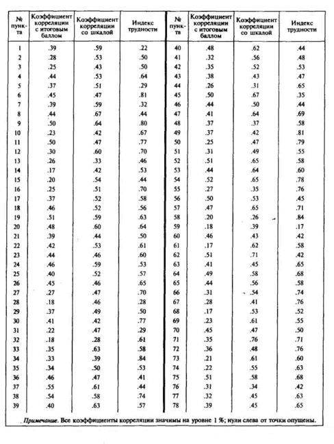 Коэффициенты корреляции пунктов со шкалой, в которую входит пункт, и итоговым баллом, индекс трудности.