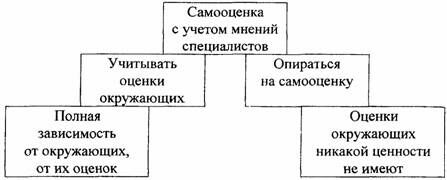 Как же объединить независимость от оценок окружающих с признанием значения их оценок? Возможно ли это? Один из вариантов - оценивать свой труд по достижениям специалистов в твоей области деятельности, или, если ты учишься, оценивать свои достижения по достижениям тех, кто учится вместе с тобой. В этом случае самооценка строится с учетом внешней реальности. Оценки результатов труда людьми знающими, компетентными, находящимися в нормальном психологическом состоянии (настроении) более обоснованны, чем мнения случайных и не подготовленных к этому людей. Поэтому можно определить для себя круг значимых лиц, с оценками которых следует считаться. Самооценка и восприятие оценок со стороны окружающих в этом случае взаимосвязаны.