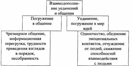Баланс сознательного поведения и внимания к подсознанию, а также баланс интереса к объекту творчества и самонаблюдения неизбежно выводит на вопрос соотношения общения и уединения. Без уединения самоанализ, самонаблюдение невозможны. Да и самовыражение результатов творчества требует времени, взаимодействие с другими при этом обычно не предполагается. Поэтому следующая группа "выясняемых" отношений - баланс общения и уединении, представлена в схеме ниже: