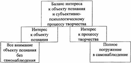 Однако, если думать только об объекте, отвлекаясь от своих состояний, от самонаблюдения, создание условий творчества, приводящих к результату, может выпасть из внимания, в итоге новые результаты будут получаться вследствие совпадения тех условий, которые не контролируются и возникают в значительной степени случайно. Другой вариант - интерес к процессу творчества, попытки разобраться в состояниях творчества, с тем, чтобы лучше ими управлять, интерес к трансформациям состояний у себя, самонаблюдение, самоанализ. Знание этих состояний позволяет создать более благоприятные условия для творчества, следовательно, способствует получению новых результатов. Новые результаты способствуют изучению процесса творчества у себя, шлифовке творческого поведения и т. д.