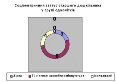 У результаті проведення даного тестування було виявлено, що серед досліджуваних дітей переважають ті, з ким однолітки залюбки спілкуються - 8 дітей, статус "Зірка" у групі отримали 3 дітей, ізольованими серед однолітків виявилось 4 дітей старшого дошкільного віку, відкинутими однолітками від спілкування не виявилось жодної дитини.