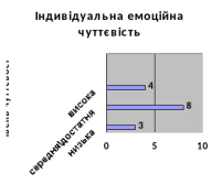 В результаті даного обстеження ми виявили, що 3 досліджуваних дітей старшого дошкільного віку мають низьку індивідуальну емоційну чутливість, 8 детей - достатню або середню індивідуальну емоційну чутливість, і лише 4 досліджуваний виявили схильність до підвищеної індивідуальної емоційної чутливості. Отримані результати можна зобразити так: