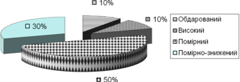 | Помірно-знижений | негармонійна тенденція: помірний рівень розвитку творчого, низький рівень розвитку інтелектуального, поведінково-результативного компонентів | 5 |