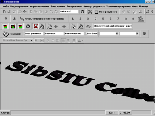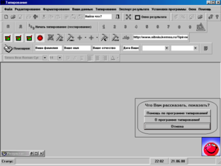 виводить форму з даними про програму типирования: інформація про автора, адреса його E-mail, відомості про систему.