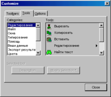 , то з'явиться вікно настроювання панелі керування (рис. 39). Тут можна не тільки додати або забрати командні панелі з панелі керування програми, але й додати або видалити окремі кнопки з окремих командних панелей.