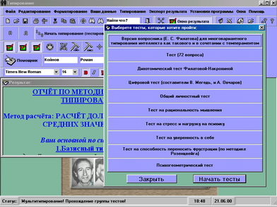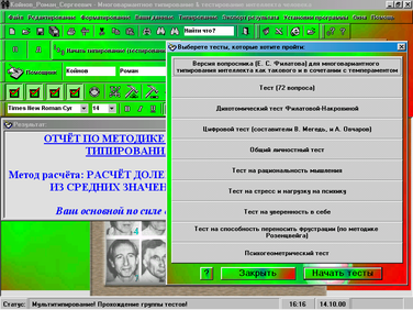 Впровадження отриманих результатів. Випробуване мною програмне забезпечення, системи типирования, з високим ступенем вірогідності склало спектральні моделі типів особистості. Моя згода з підсумками комплексного дослідження 80%. Уважаю, що дане програмне забезпечення повинне бути використане в ході професійного самовизначення учнів ПТУ. Таким чином, буде досягнута мета - профорієнтація школярів відповідно до його типу інтелекту, внутрішнім миром і целеустремлениями. Що в остаточному підсумку буде якісним показником при подальшому навчанні по обраних спеціальностях.