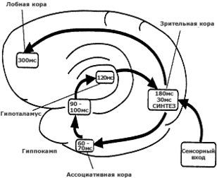 4. Суть концепции информационного синтеза: субъективный опыт возникает в результате определенной организации процессов мозга и сопоставления в зонах коры вновь поступившей информации с извлеченной из памяти. По Иваницкому, анализ раздражений происходит в определенной последовательности. Сначала стимулы анализируются по их физическим характеристикам, а затем на основе сопоставления этих характеристик с памятью происходит определение значимости стимулов для организма. Синтез информации о физических и сигнальных характеристиках стимула осуществляется в корковых центрах. Он является основой комплексной оценки сигналов, на базе которой происходит выработка целенаправленного поведения. Информационный синтез играет важную роль в осуществлении психических функций, в первую очередь ощущения и восприятия.