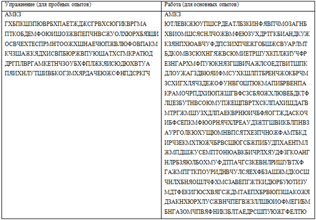 Инструкция: "Перед тобой карточка с изображением напечатанных букв. В каждой строчке зачеркивай карандашом только три буквы — А, К, X. Если я буду своим карандашом ставить какие-либо знаки, не обращай внимания и продолжай работать. Приступай к выполнению задания".