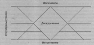 В отечественной психологии наиболее целостную концепцию творчества как психического процесса предложил Я. А. Пономарев (1988). Он разработал структурно-уровневую модель центрального звена психологического механизма творчества. Изучая умственное развитие детей и решение задач взрослыми, Пономарев пришел к выводу, что результаты опытов дают право схематически изобразить центральное звено психологического интеллекта в виде двух проникающих одна в другую сфер. Внешние границы этих сфер можно представить как абстрактные пределы (асимптоты) мышления. Снизу таким пределом окажется интуитивное мышление (за ним простирается сфера строго интуитивного мышления животных). Сверху - логическое (за ним простирается сфера строго логического мышления компьютеров).