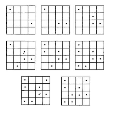 Досліджуваному, короткочасно, зазвичай, протягом 1 секунди, показують послідовно 8 карток з зображенням 2-9 крапок. Кожна картка експонується двічі, після цього учень протягом 10-15 секунд на бланку відмічає розташування крапок.