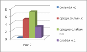 По результатам второй группы, в ней отсутствуют школьники с сильной нервной системой, на рис2 мы видим, что у большинства испытуемых 7 из 15 преобладают средне -слабая нервная система, которая характеризуется как промежуточная между средней и слабой нервной системой.