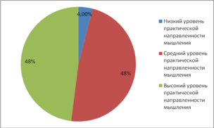 Отсюда следует, что всего лишь 4% опрошенных имеют низкую выраженность практической направленности мышления, а 96% опрошенных имеют соответственно среднюю и высокую направленность практического мышления (См. диаграмму №1).