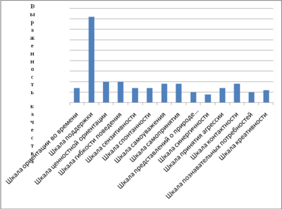 Как можно определить по приведенной диаграмме, у воспитанников школы-интерната наиболее выражена шкала поддержки, хотя уже на момент начала тестирования можно было предположить, что она будет лидировать, так как на её определение было отведено больше всего вопросов. Остальные шкалы примерно одинаково соотнесены между собой (см. гистоаграмму №3).