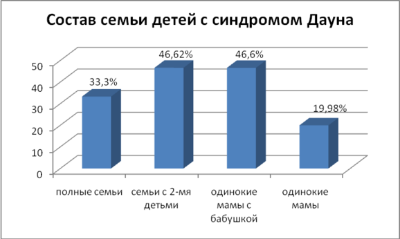 Среди семей, участвующих в исследовании, 5 являются полными, то есть у ребенка есть мама и папа. У семи детей есть старшие брат или сестра. В семи семьях ребенка с синдромом Дауна воспитывают мама с бабушкой, из них в трех семьях есть дедушка.