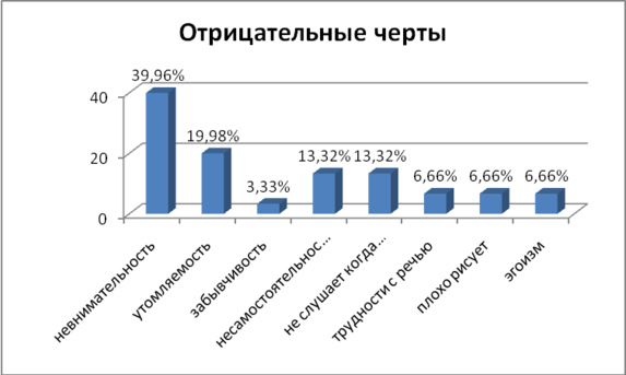На рисунке 3 показаны отрицательные черты в поведении детей, которые не устраивают их родителей. Шесть семей называют невнимательность. Родителям не нравится, что дети быстро утомляются, не слушают, когда им читают, недостаточно самостоятельны.